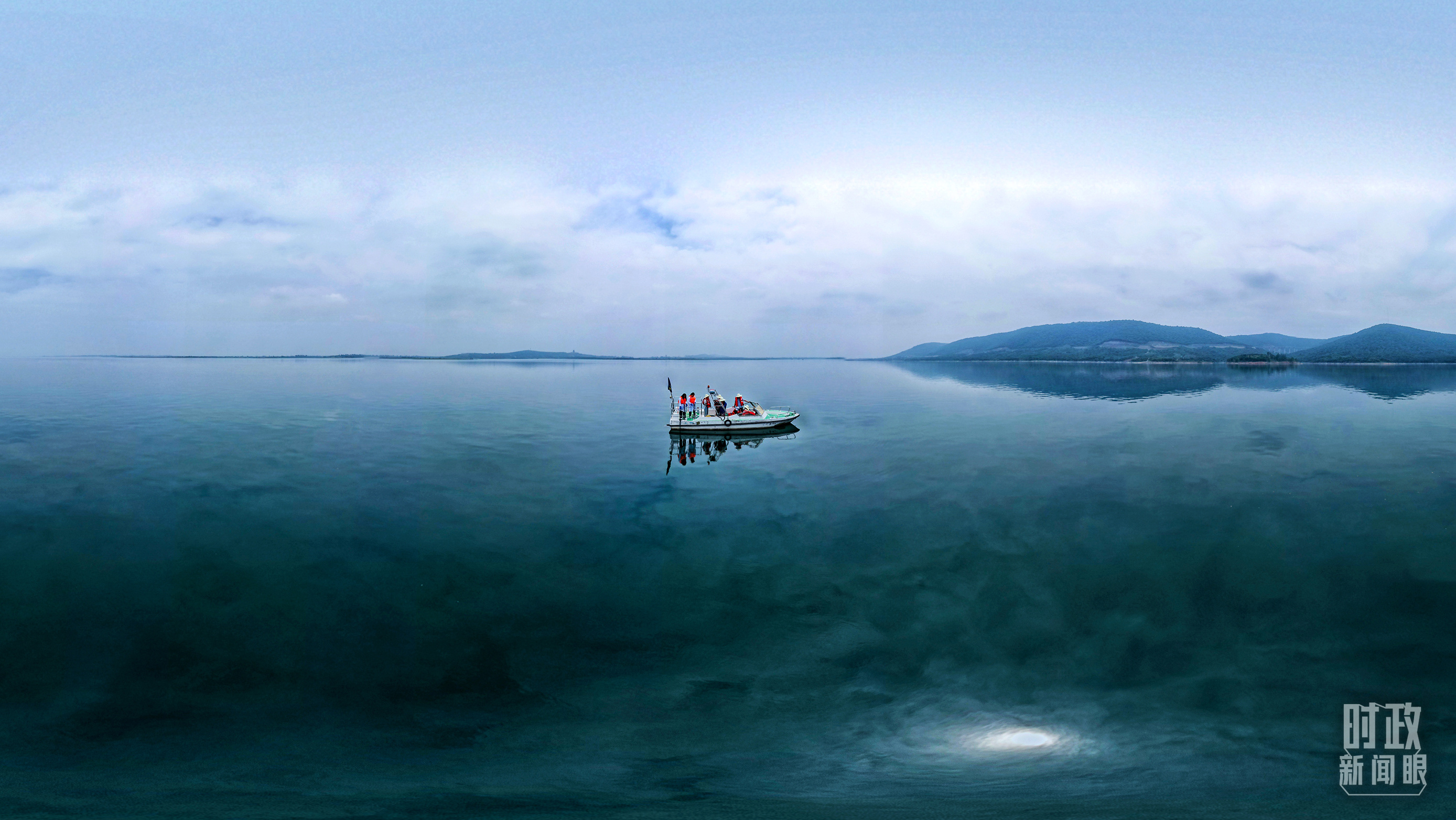△丹江口水库,工作人员正在采集水样。(总台国广记者李晋拍摄)