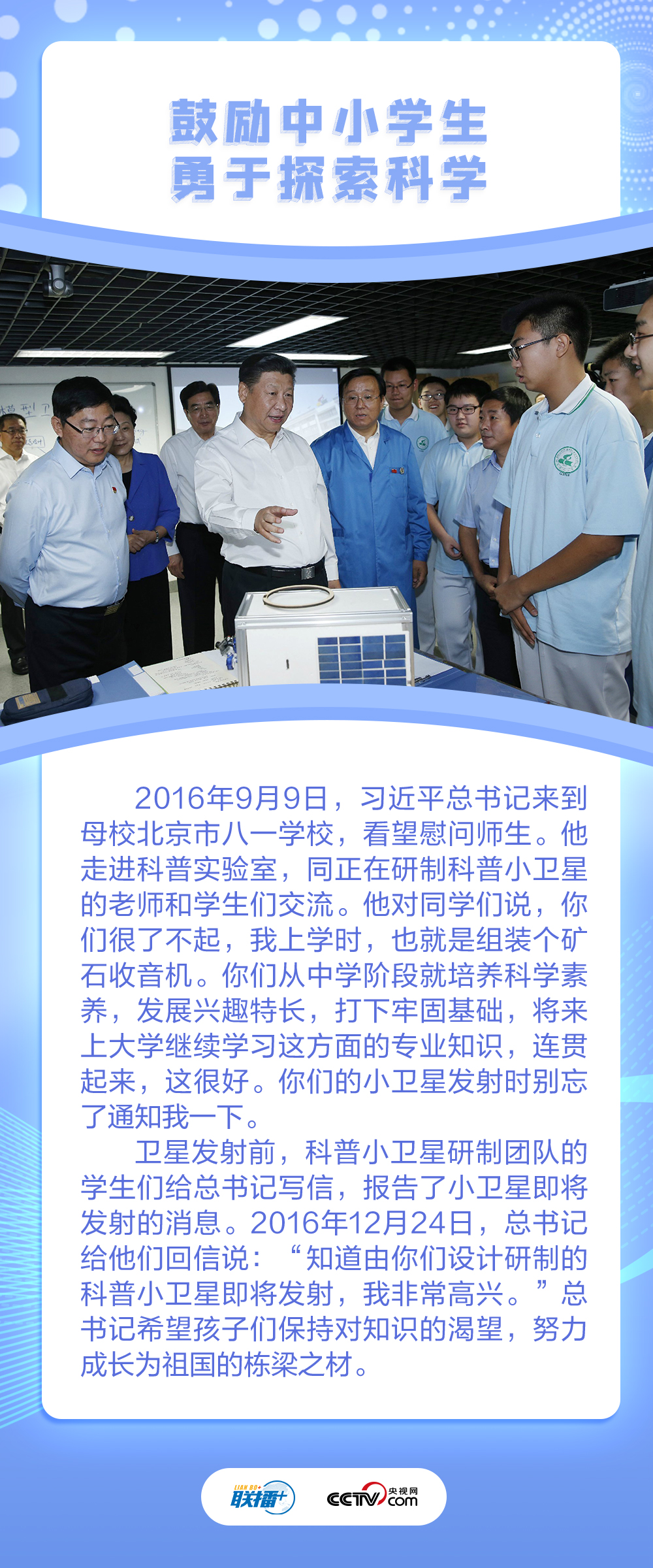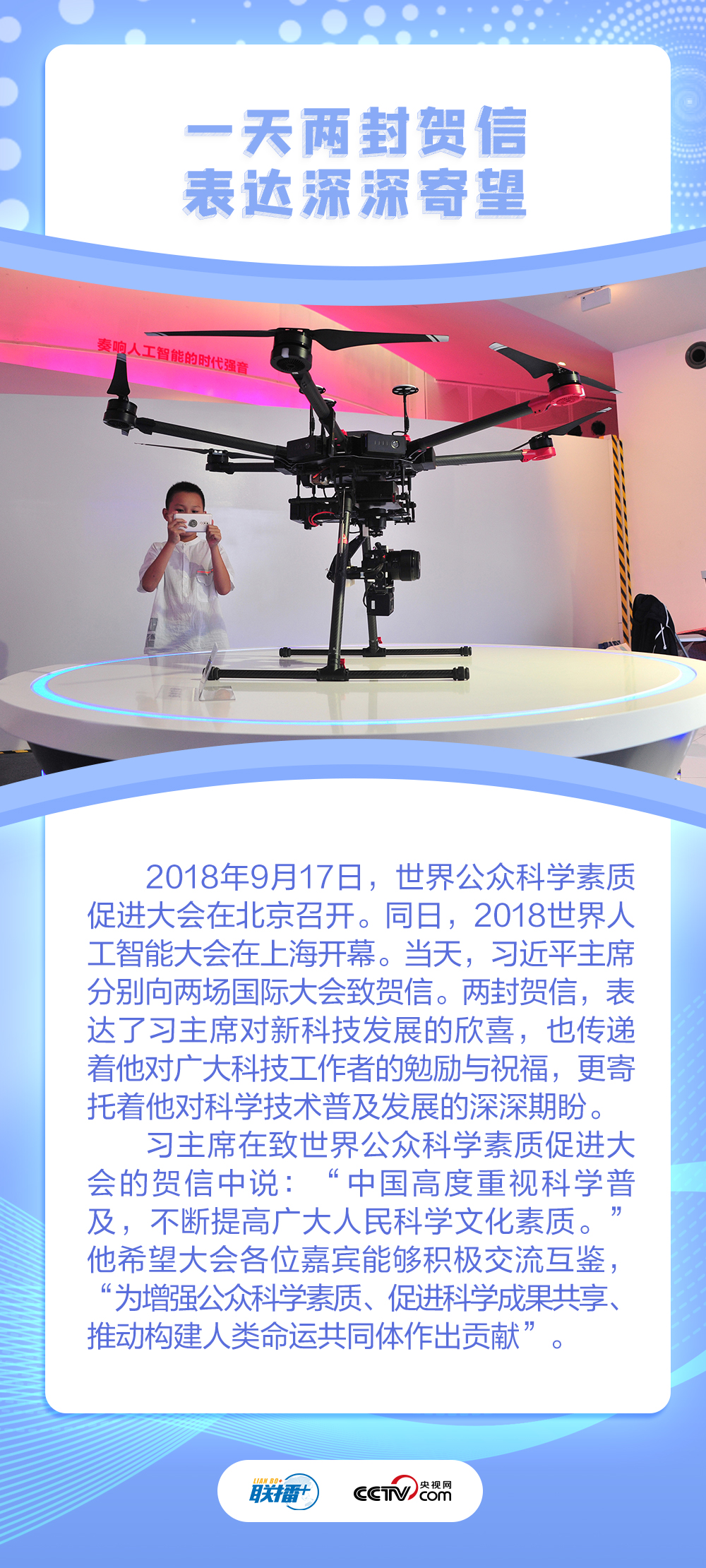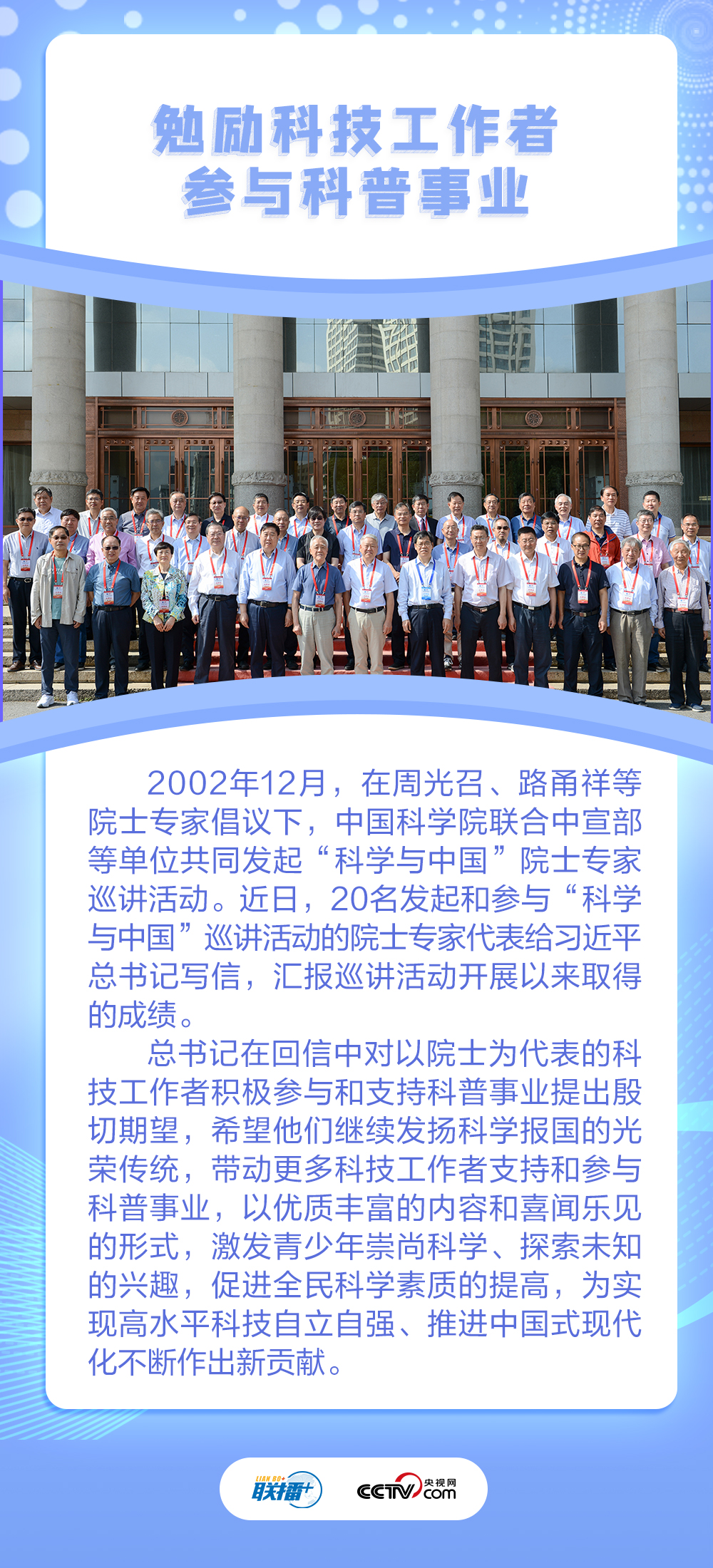 联播+“多年来,你们积极参加‘科学与中国’巡讲活动,广泛传播科学知识、弘扬科学精神,在推动科学普及上发挥了很好的作用。”