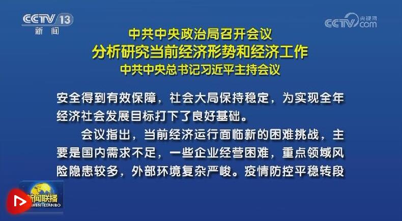 7月24日,中共中央政治局召开会议,分析研究当前经济形势,部署下半年经济工作。习近平总书记主持会议。