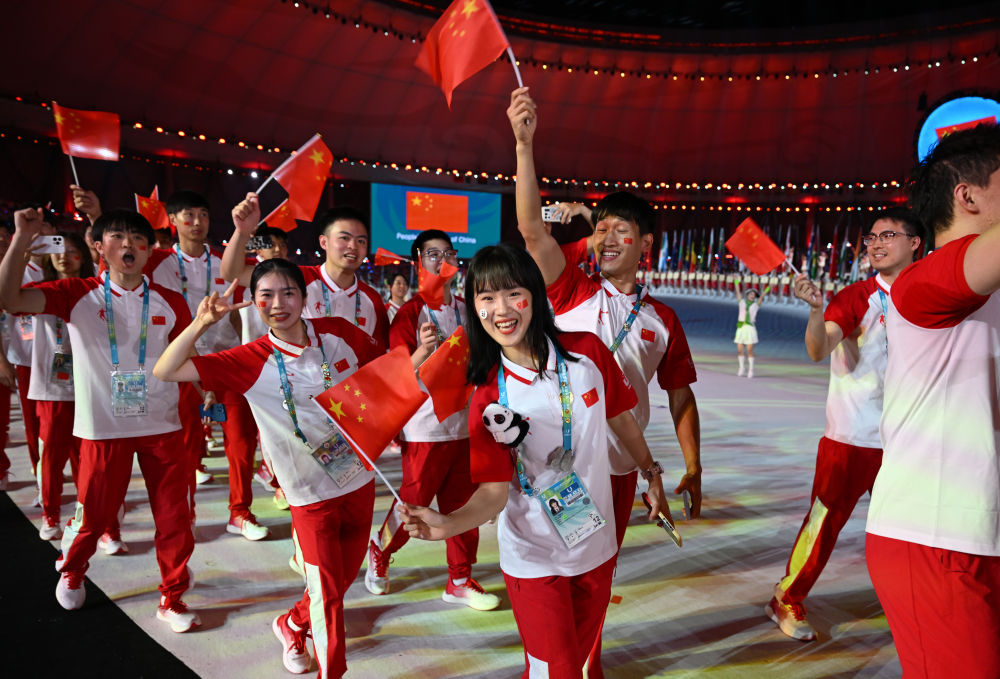 中国大学生体育代表团在开幕式上入场。