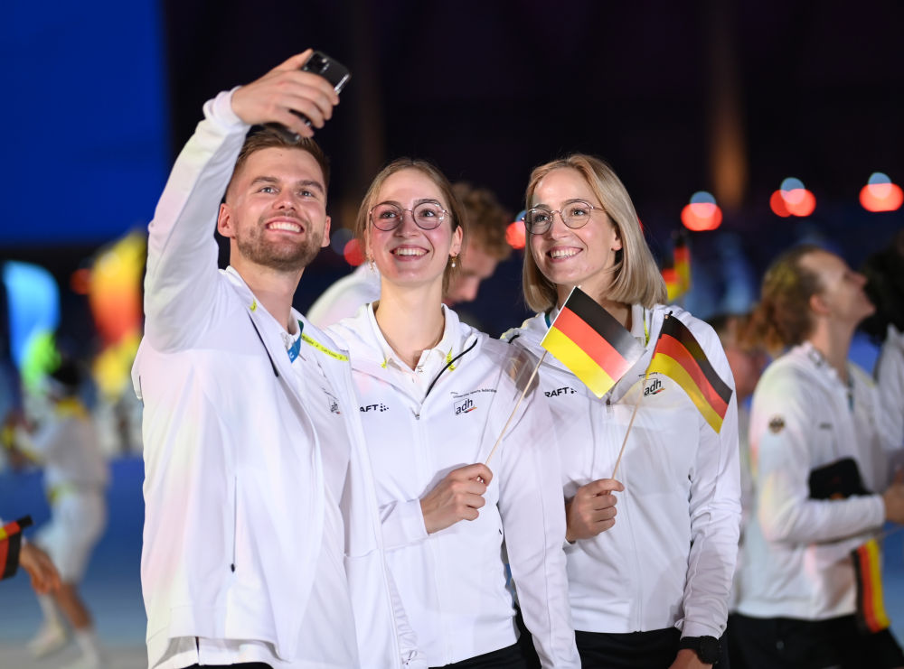 德国大学生体育代表团在开幕式上入场。