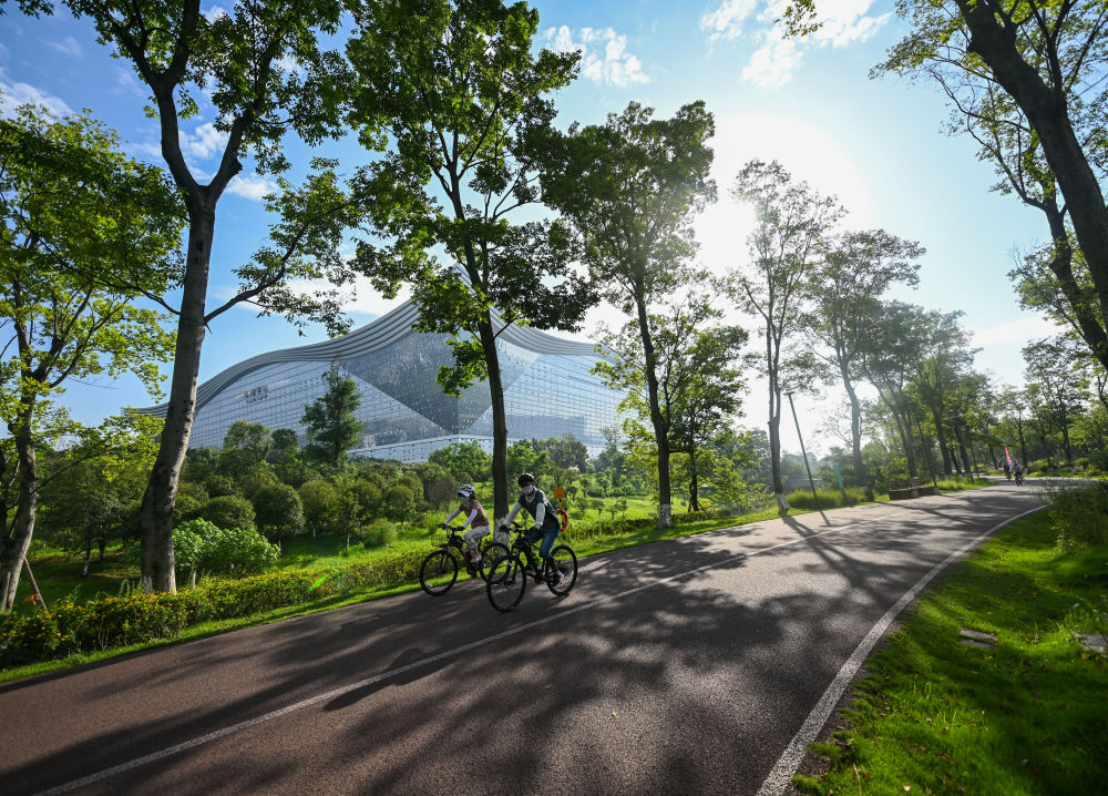 人们在成都高新区桂溪生态公园骑行。