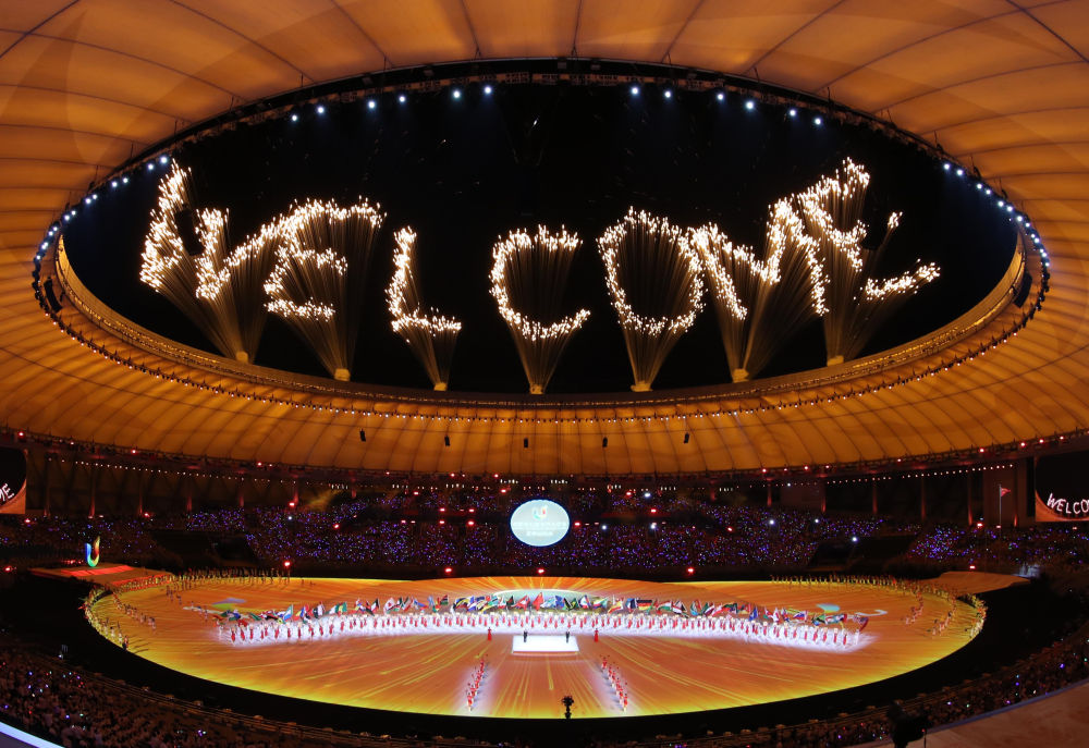 璀璨焰火,照亮碧波荡漾的东安湖,在世界各地青年学生的热切注目中,第三十一届世界大学生夏季运动会开幕。