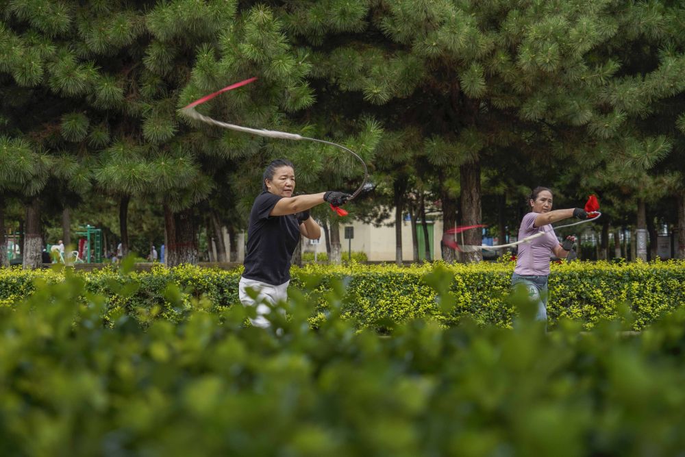 2023年8月6日,市民在河北省遵化市人民公园练习健身鞭。新华社发(刘满仓摄)