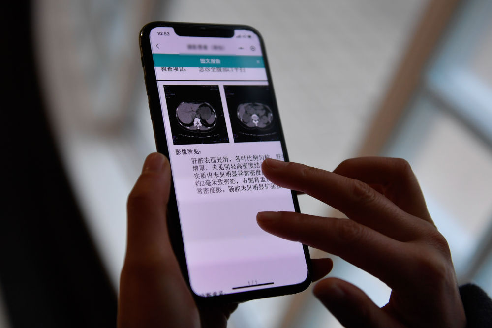 2021年1月20日,在杭州市余杭区第一人民医院,居民通过手机使用“健康余杭智慧云共享平台”查看检查图文报告。新华社记者 黄宗治 摄