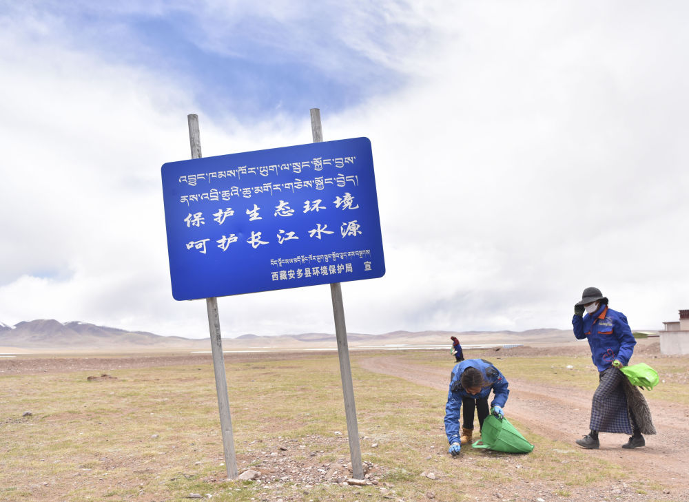 2019年5月28日,玛曲乡村民在捡拾垃圾。为保护长江源生态环境,西藏安多县玛曲乡每周都会在全乡范围内组织“保护长江源”捡拾垃圾活动,由各村党员志愿者带头,生态巡护员参与,群众自愿参加。