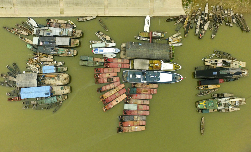 这是2019年12月17日在湖南常德汉寿县蒋家嘴镇拍摄的停靠在洞庭湖边的渔船(无人机照片)。2020年1月1日零时起,长江流域332个自然保护区和水产种质资源保护区全面禁止生产性捕捞。长江流域各地重点水域也相继进入为期十年的常年禁捕期。