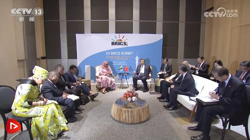 当地时间8月24日上午,国家主席习近平在约翰内斯堡出席金砖国家领导人会晤期间会见坦桑尼亚总统哈桑。
