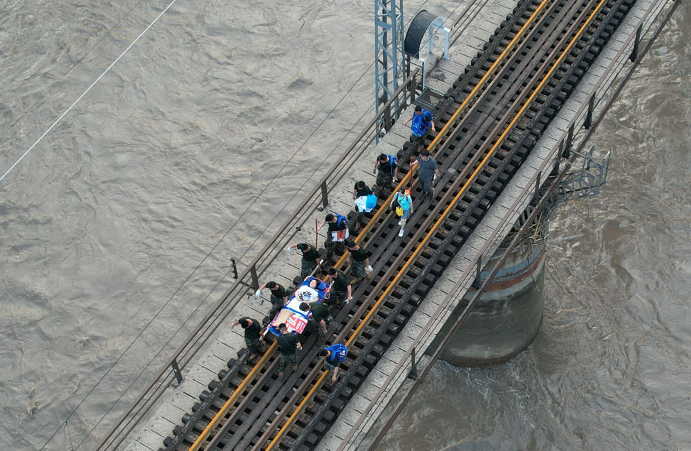 8月6日,在吉林省舒兰市开原镇新开村被洪水冲毁的断桥上,吉林市消防救援支队队员利用绳桥解救受困村民。