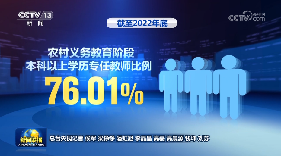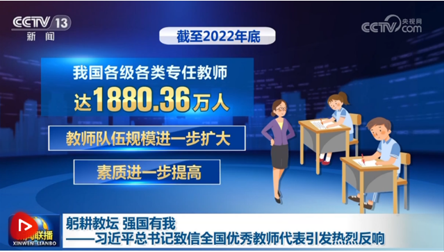 强教必先强师。党的十八大以来,以习近平同志为核心的党中央高度重视教师队伍建设,中国特色教师教育体系形成新局面,教师队伍素质不断提升,结构不断优化。数据显示,截至2022年底,我国各级各类专任教师达1880.36万人,全国义务教育阶段本科以上学历专任教师比例为81.02%,其中,农村义务教育阶段本科以上学历专任教师比例为76.01%。新征程上,大家表示,要全面落实立德树人根本任务,树立“躬耕教坛、强国有我”的志向和抱负,培养更多德智体美劳全面发展的社会主义建设者和接班人。