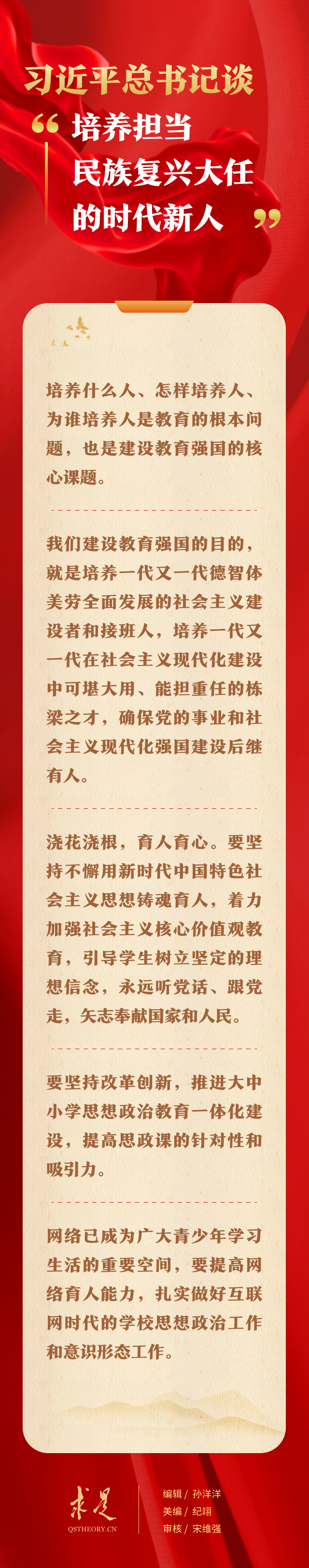 9月16日出版的第18期《求是》杂志刊发习近平总书记重要文章《扎实推动教育强国建设》。在这篇重要文章中,总书记从“培养担当民族复兴大任的时代新人”、“加快建设高质量教育体系”、“全面提升教育服务高质量发展的能力”、“在深化改革创新中激发教育发展活力”、“增强我国教育的国际影响力”、“培养高素质教师队伍”6个方面,对扎实推动教育强国建设提出明确要求。