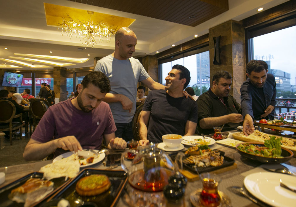在义乌经营餐厅的约旦老板穆罕奈德(左二)与朋友们聊天,他2002年来到义乌创业,并在此安家。