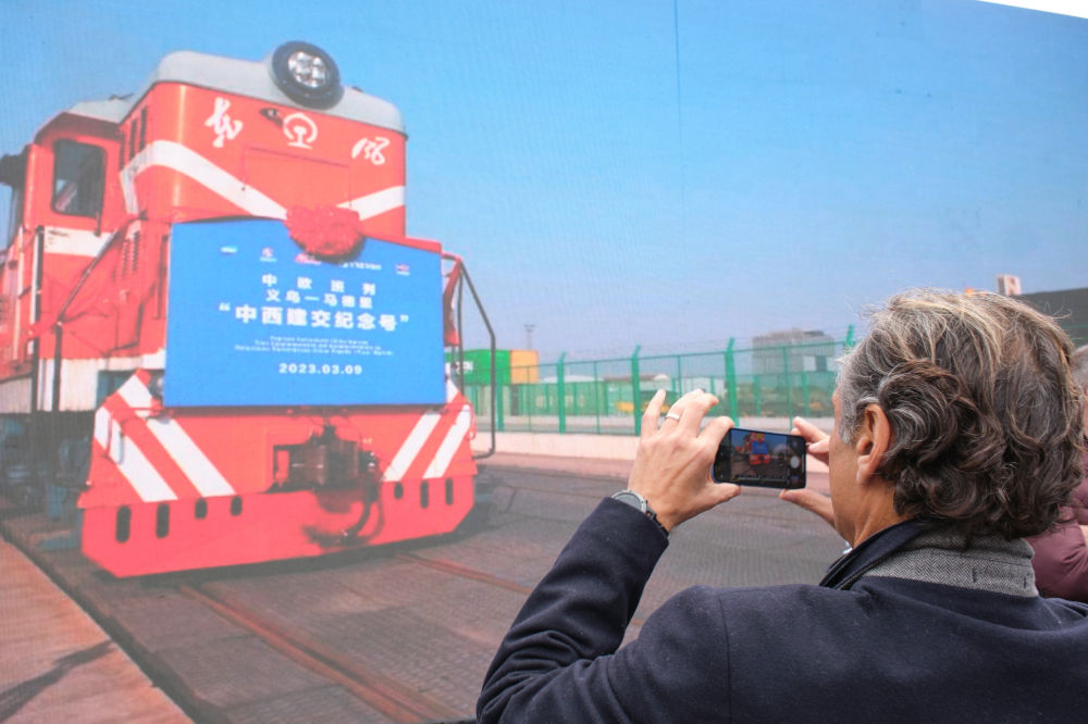 2023年3月9日,一列装载着小商品、电子产品、日用百货等货物的“中西建交纪念号”中欧班列从浙江义乌铁路西站奔赴西班牙首都马德里。一列装载着红酒、橄榄油等西班牙特色产品的班列也从马德里出发,相向而行,驶向义乌。
