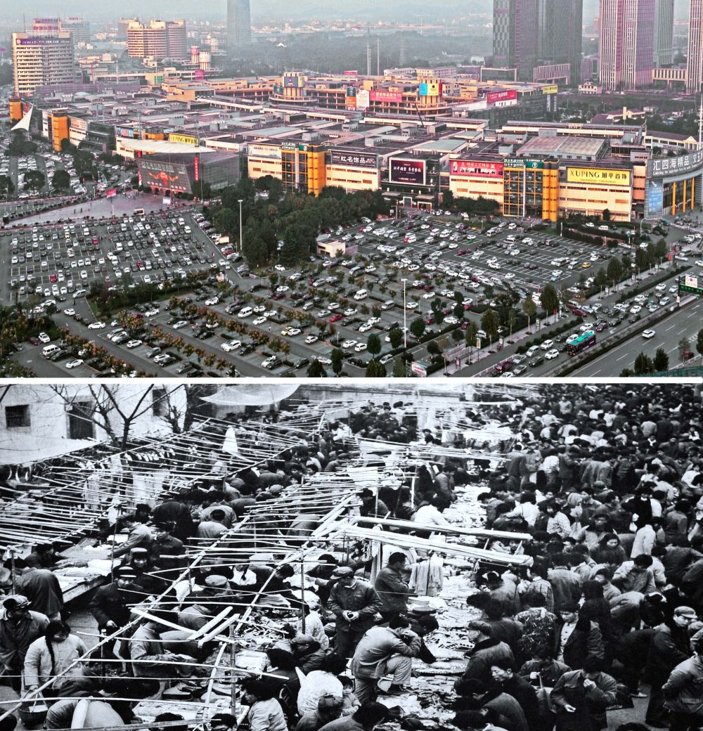 2018年拍摄的义乌国际商贸城一区市场(上)和1982年9月开业的义乌第一代小商品市场(下)。