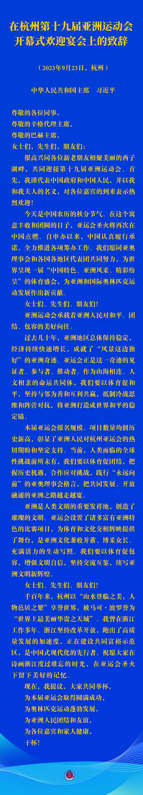 很高兴同各位新老朋友相聚美丽的西子湖畔,共同迎接第十九届亚洲运动会。首先,我谨代表中国政府和中国人民,并以我和我夫人的名义,对各位嘉宾的到来表示热烈欢迎!