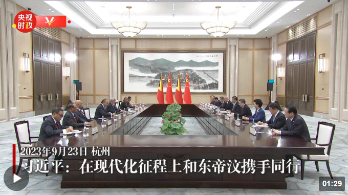 9月23日上午,国家主席习近平在杭州西湖国宾馆会见来华出席第19届亚洲运动会开幕式的东帝汶总理夏纳纳。