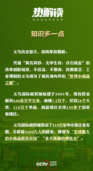 “小生意”也能闯出“大市场”。这座全球单体面积最大的小商品批发市场共有7.5万家商铺,年成交额超过2000亿元;来自世界各地的客商到这里采购商品、洽谈合作,日均客流量超过20万人次;平均每天有3000万件快递从这里发出,寄给全球各地的客户……