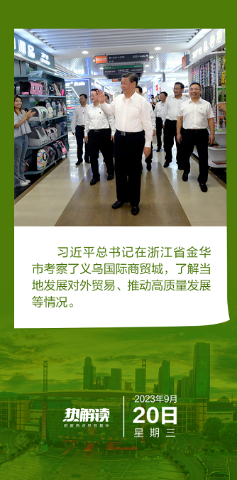 9月20日,习近平总书记到浙江考察的第二站,是义乌国际商贸城。走进这座“买卖全球”的“世界超市”,总书记考察了五金工具配件商铺、伞铺等,详细了解义乌国际商贸城发展对外贸易、推动高质量发展等情况,并鼓励商户们:“义乌的小商品、大市场,不断地再造新的辉煌。”