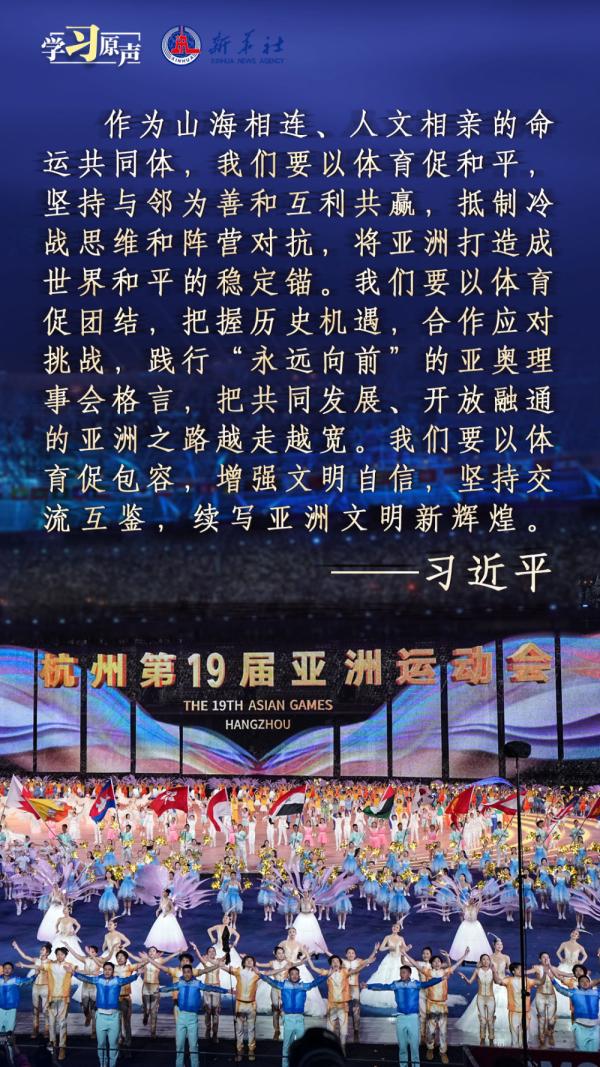 秋分时节,举世瞩目的杭州第十九届亚洲运动会隆重开幕。“亚洲运动会承载着亚洲人民对和平、团结、包容的美好向往。”习近平主席在杭州第十九届亚洲运动会开幕式欢迎宴会上的致辞,传递着热情友好的情谊,宣示了新时代中国推动亚洲大家庭团结合作的坚定决心,为促进亚洲和国际奥林匹克运动发展、共建亚洲命运共同体注入强大信心与力量。