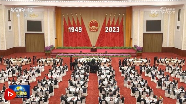 人民大会堂宴会厅华灯璀璨、鲜花绽放,洋溢着喜庆热烈的节日氛围。主席台上方高悬着庄严的国徽,“1949-2023”大字年号在鲜艳的红旗映衬下格外醒目。