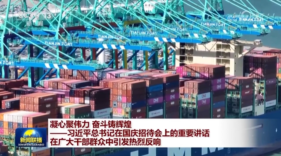 今年以来,我们积极推进对外开放、科技创新、绿色发展,经济总体回升向好。总书记的讲话,激励着奋斗的人们。这个中秋国庆假期,天津港码头依然繁忙;安徽合肥科学岛上,新一轮实验正在紧张进行;河西走廊巴丹吉林沙漠,大家正忙着压沙造林。
