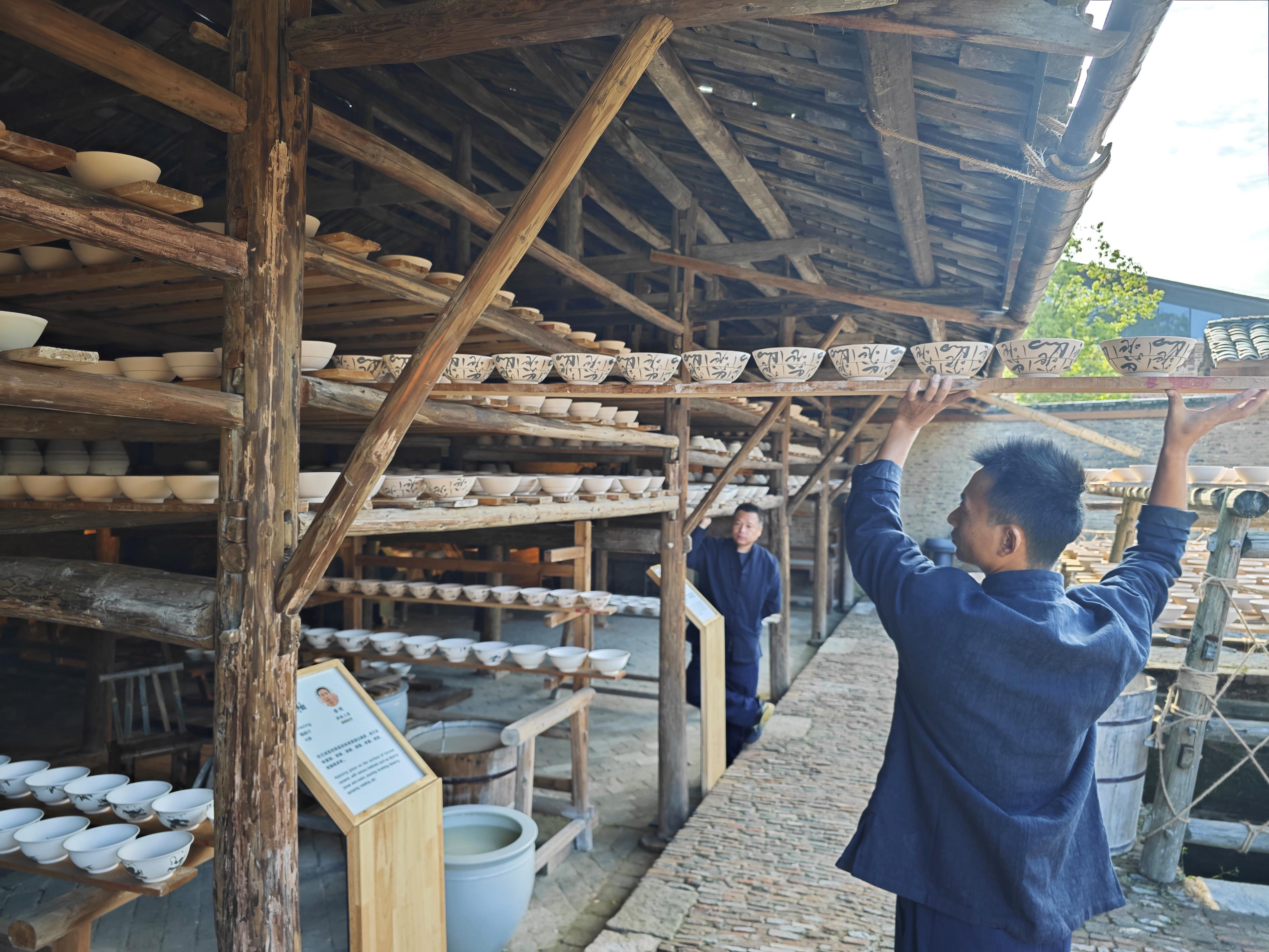 △陶阳里历史文化街区里,工匠将陶瓷工艺品放到架上晾干。(总台央视记者彭汉明拍摄)