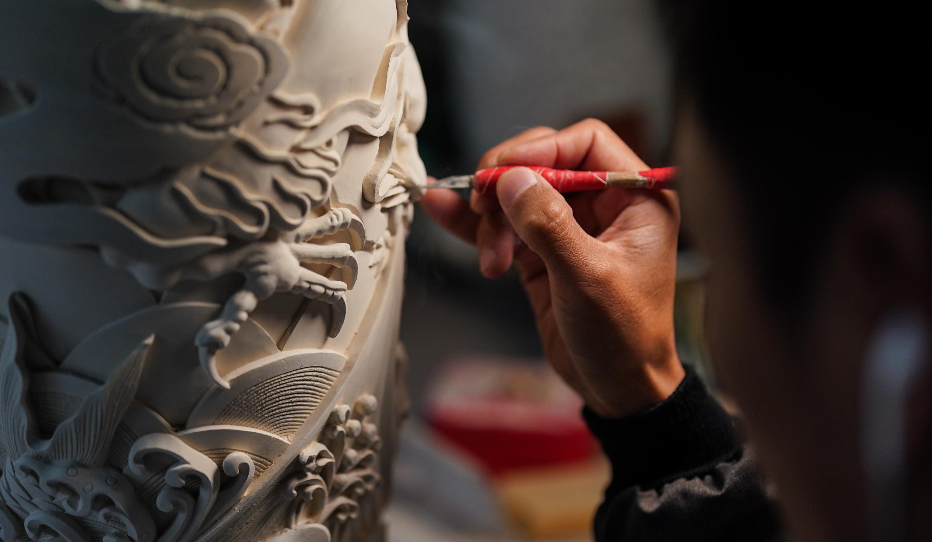 △景德镇工匠在进行陶瓷雕刻。(总台国广记者李晋拍摄)