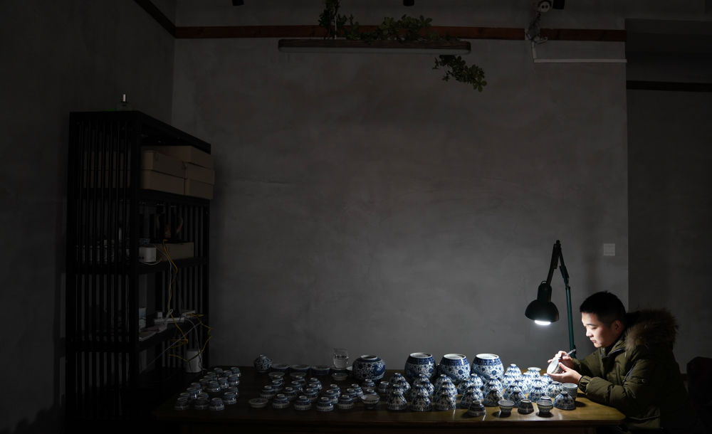 ↑ 2020年12月23日,手工陶瓷制作者在工作室检测成品。