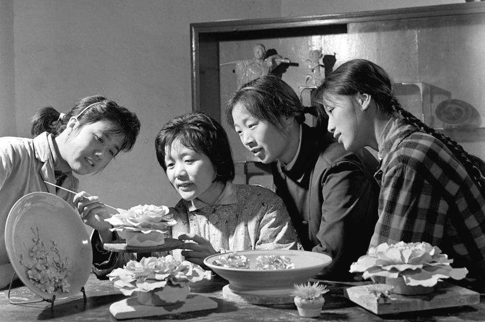 ↑ 1978年,景德镇陶瓷研究所技术人员(左二)和工人一起研究堆花技术。