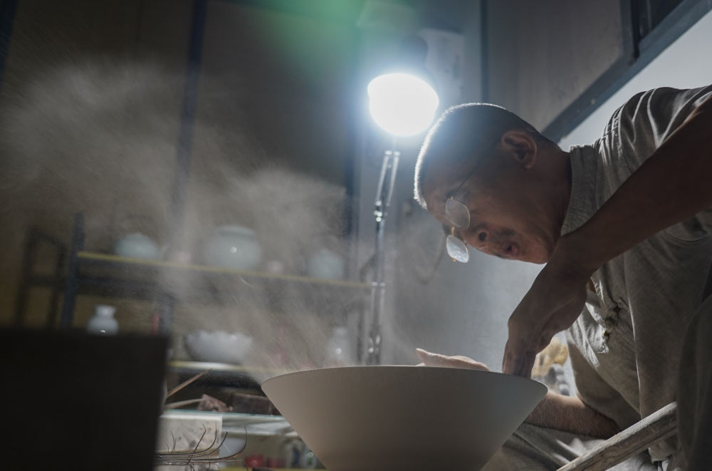 ↑ 在景德镇,手工匠人吹去坯内的泥土(2021年7月14日摄)。