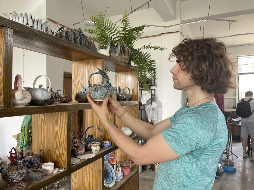 ↑在江西景德镇,美国青年丹尼斯在工作室内整理陶瓷作品(2023年5月30日摄)。