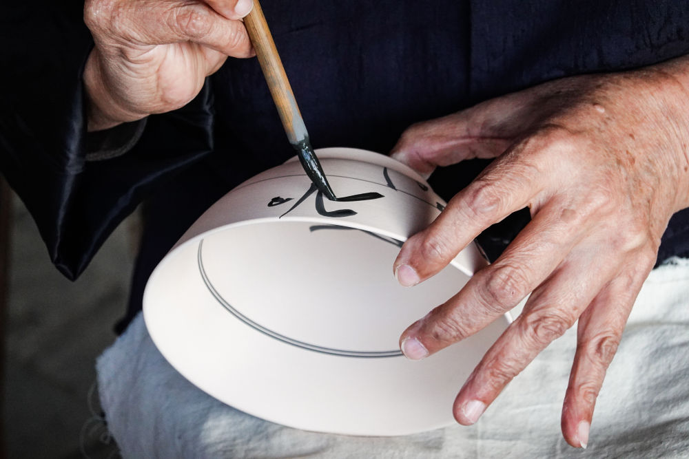 手工艺人师徒在陶阳里历史文化街区展示画坯(2023年10月11日摄)。