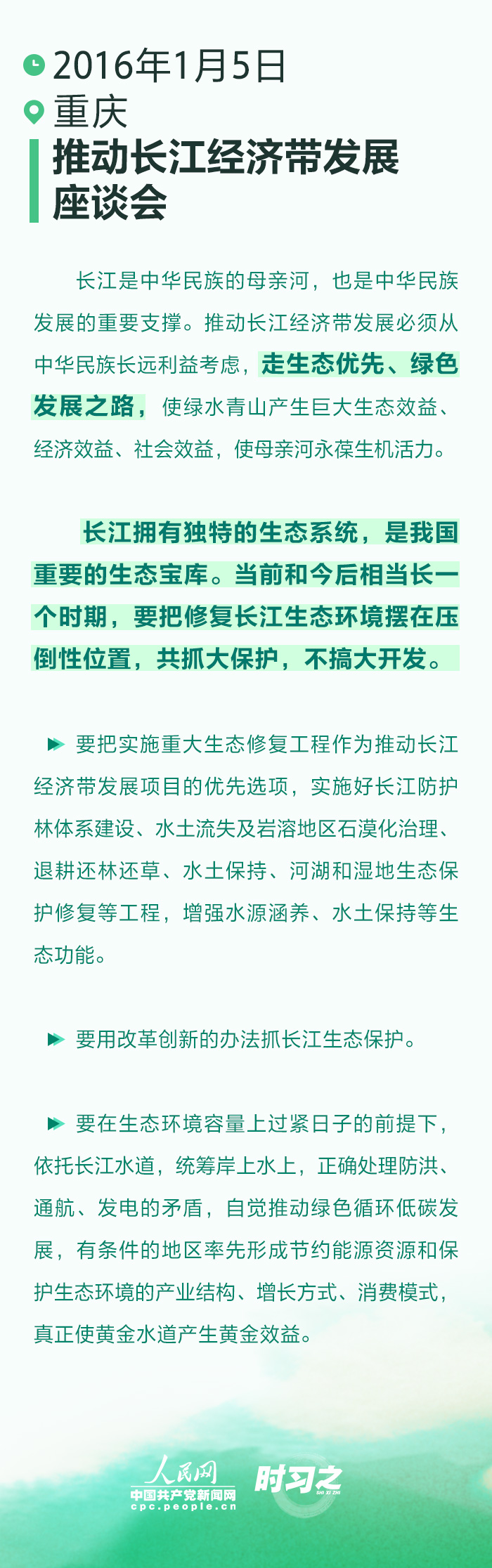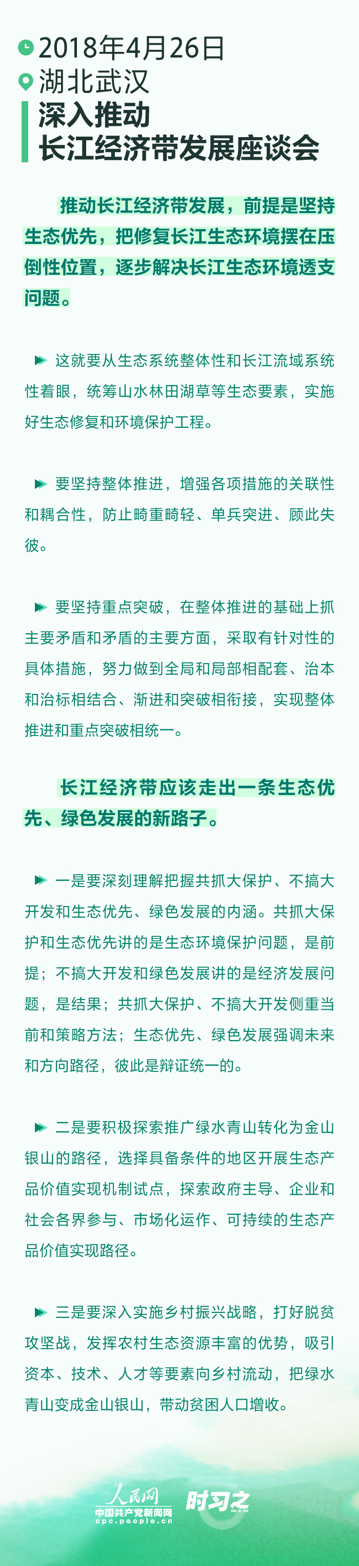 党的十八大以来,习近平总书记先后四次主持召开座谈会,强调“坚持共抓大保护、不搞大开发,坚持生态优先、绿色发展”作为重中之重,为推动长江经济带高质量发展谋篇布局。