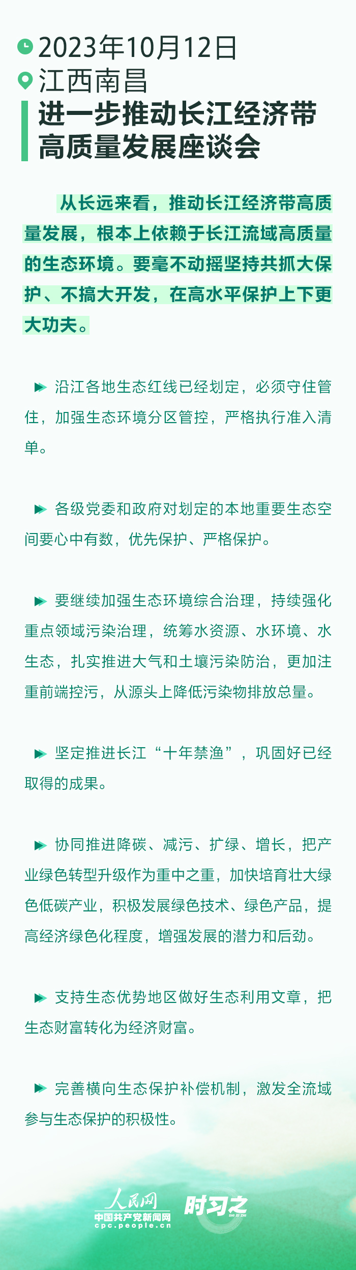 10月12日下午,习近平总书记在江西省南昌市主持召开进一步推动长江经济带高质量发展座谈会并发表重要讲话。座谈会上,总书记指出,从长远来看,推动长江经济带高质量发展,根本上依赖于长江流域高质量的生态环境。