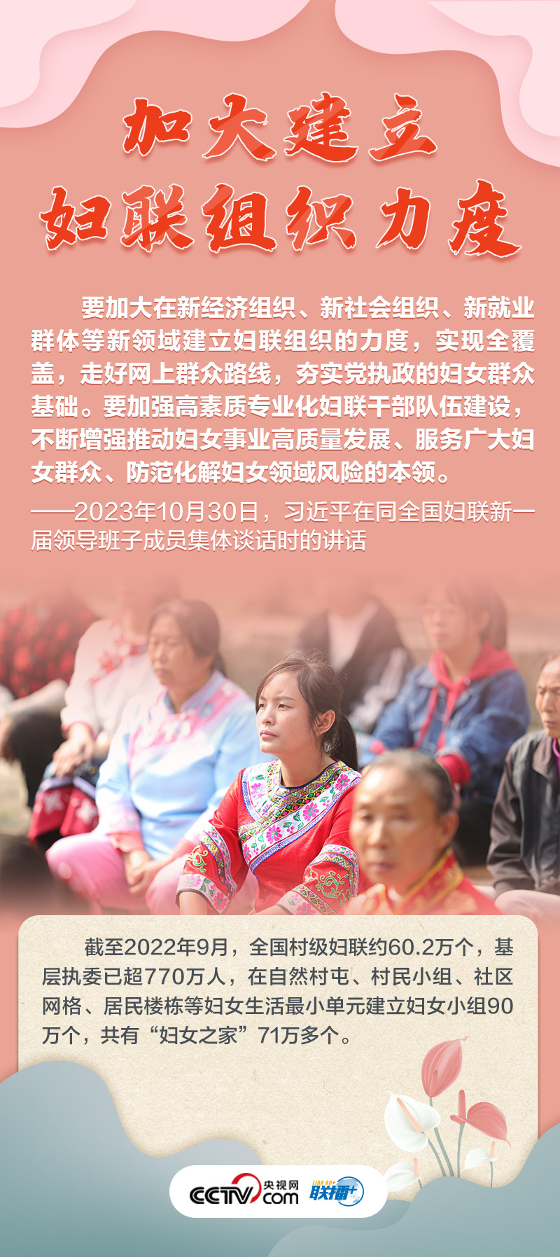 联播+“妇联是党和政府联系妇女群众的桥梁纽带。”10月30日,习近平总书记同全国妇联新一届领导班子成员集体谈话并发表重要讲话,高度肯定巾帼力量,并为新形势下妇女事业和妇联工作发展指明方向。
