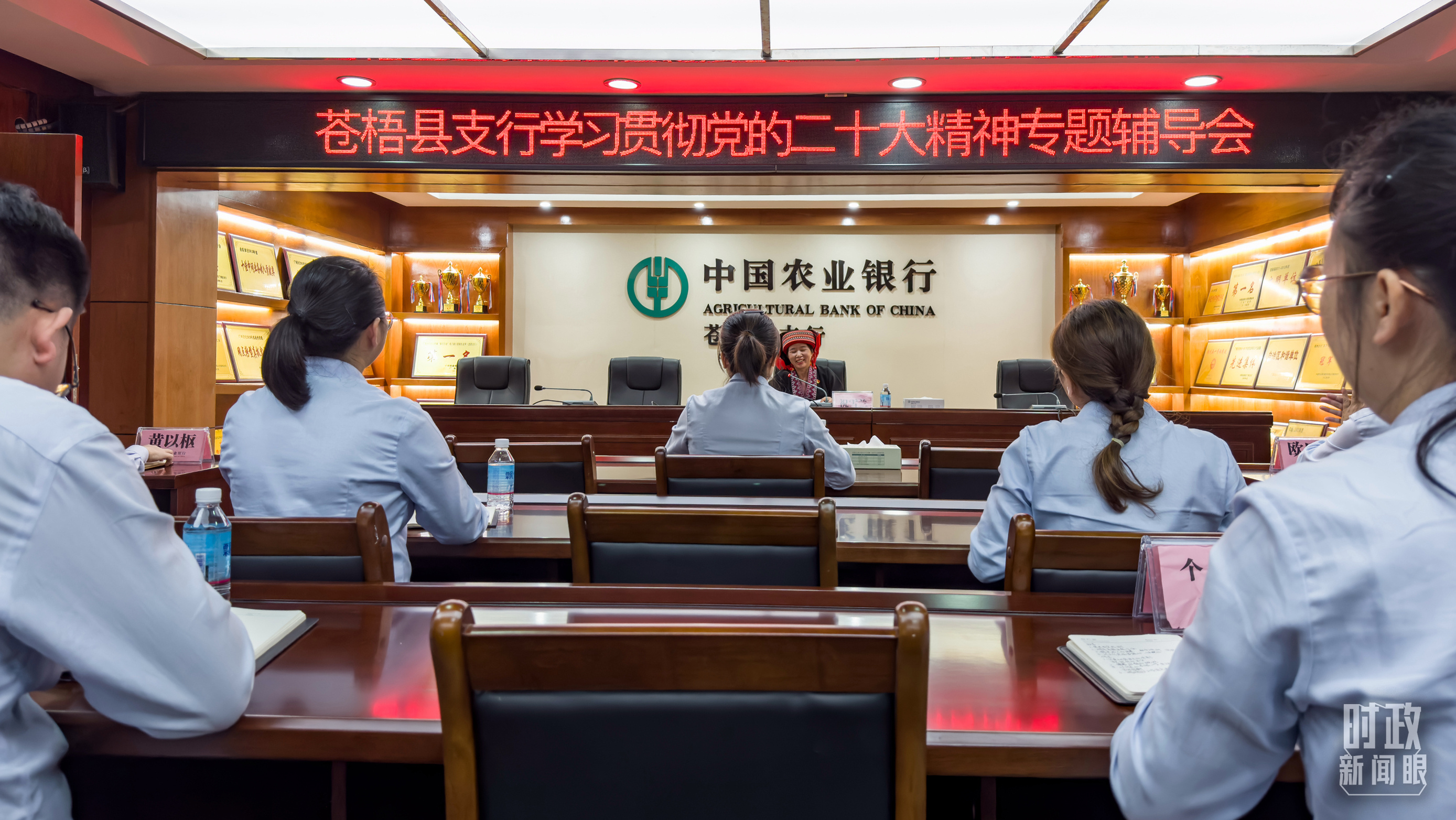 △2022年11月,广西梧州,中国农业银行苍梧县支行党委邀请党的二十大代表祝雪兰同志为苍梧县支行党员开展学习贯彻党的二十大精神专题辅导。(图/视觉中国)