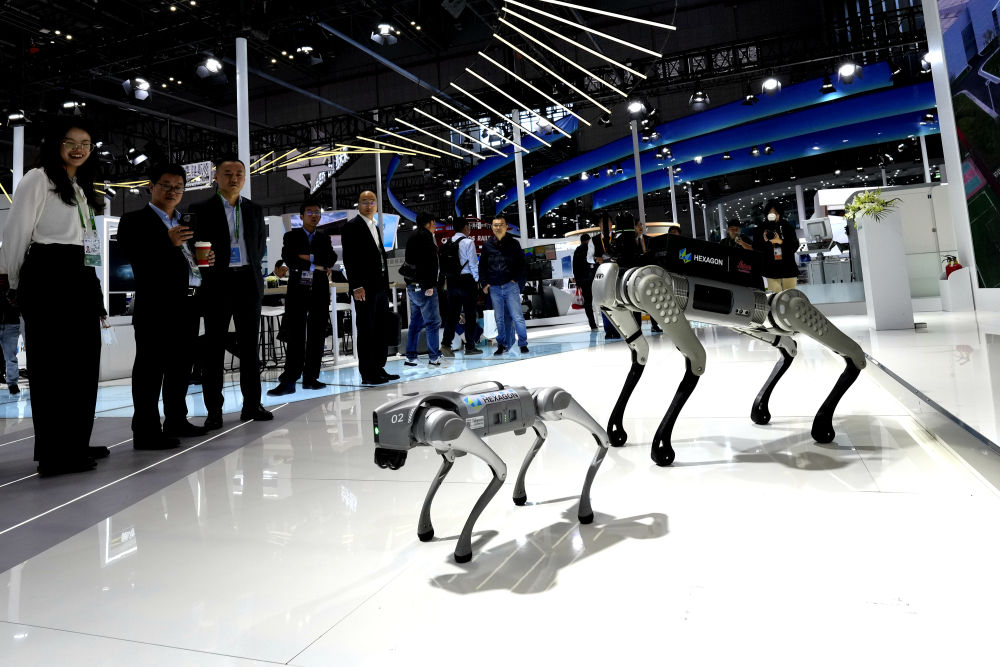 11月7日,在第六届进博会技术装备展区,观众在观看海克斯康展示的智能机器狗。