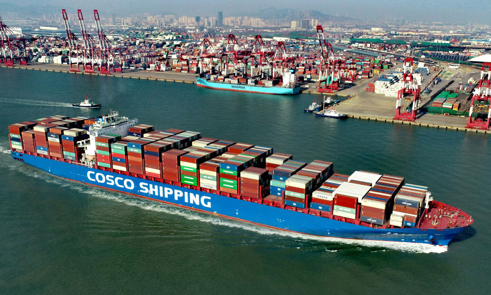 2021年2月19日,在位于山东自贸试验区青岛片区的山东港口青岛港前湾集装箱码头,一艘满载集装箱的货轮驶出港口。