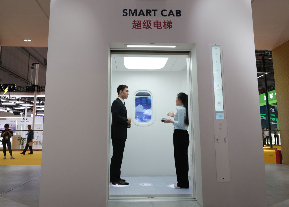 11月5日,工作人员(右)在第六届进博会上向参观者介绍奥的斯公司全新推出的超级电梯。