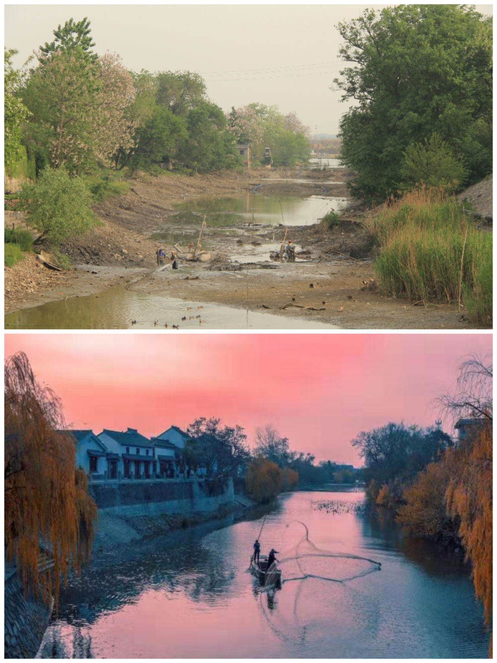 江苏省扬州市江都区明清运河故道整治前后。(上图:2012年;下图:2020年)(孙友定 摄)