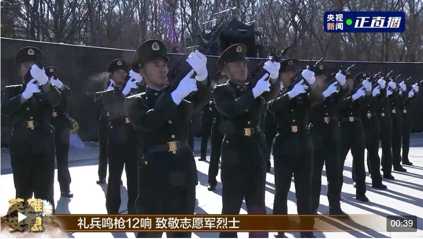 上午10时,军乐队奏响婉转的《思念曲》,在解放军仪仗司礼大队战士持枪护卫下,礼兵护送志愿军烈士棺椁缓缓步入现场,全场奏唱中华人民共和国国歌。裴金佳致祭文后,全体人员向志愿军烈士三鞠躬,27名礼兵鸣枪12响,向英烈致以崇高敬意。