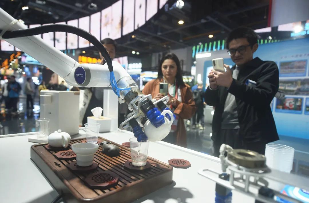 △2023年11月23日,观众在第二届全球数字贸易博览会上观看机器人泡茶。