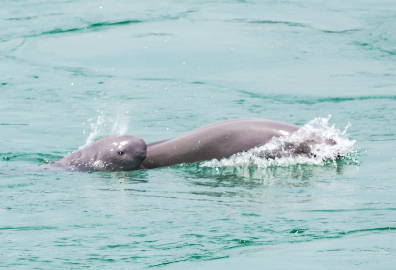 △湖北省宜昌市,江豚在葛洲坝下游水域逐浪嬉戏(2023年5月20日摄)。根据农业农村部2023年2月28日公布的2022年长江江豚科学考察结果,长江江豚种群数量为1249头。与2017年上一次科学考察相比,江豚数量出现了止跌回升的历史性转折。