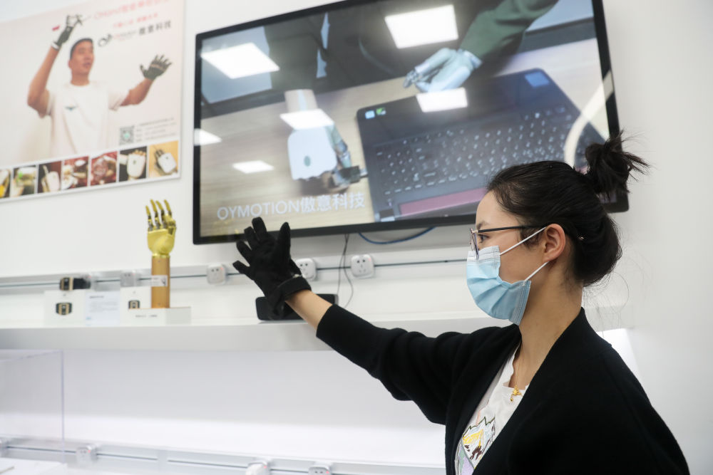 在上海张江人工智能岛内,工作人员在展示“智能神经仿生手”(2020年11月3日摄)。