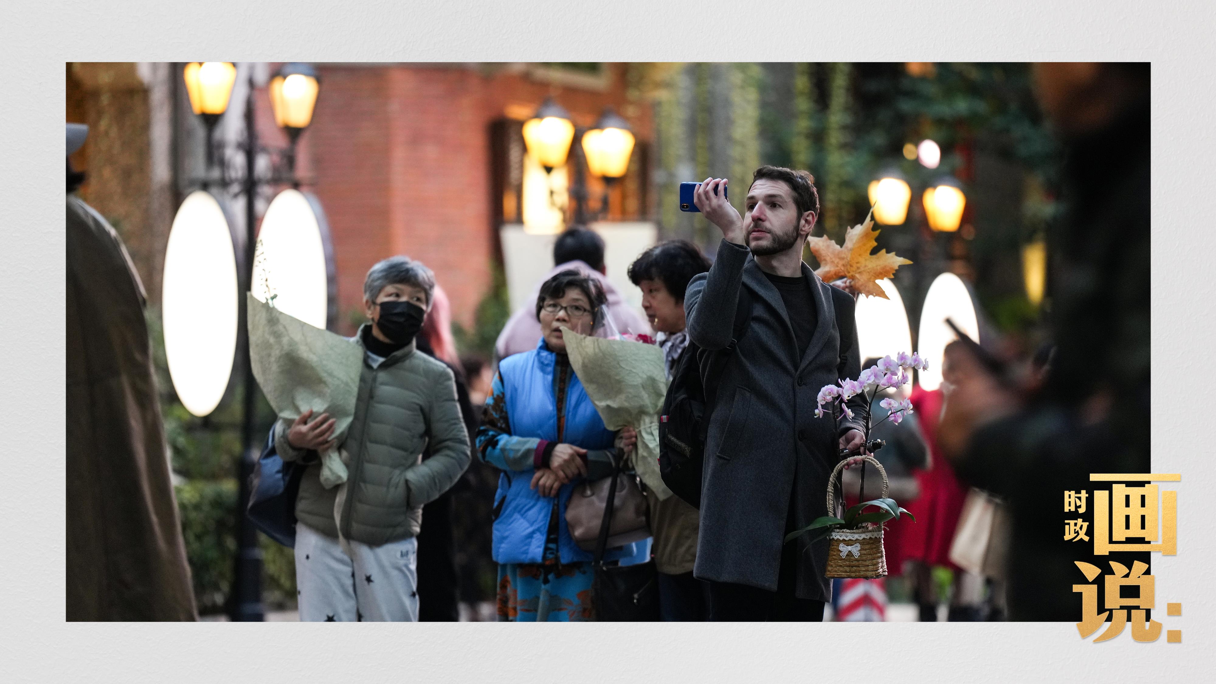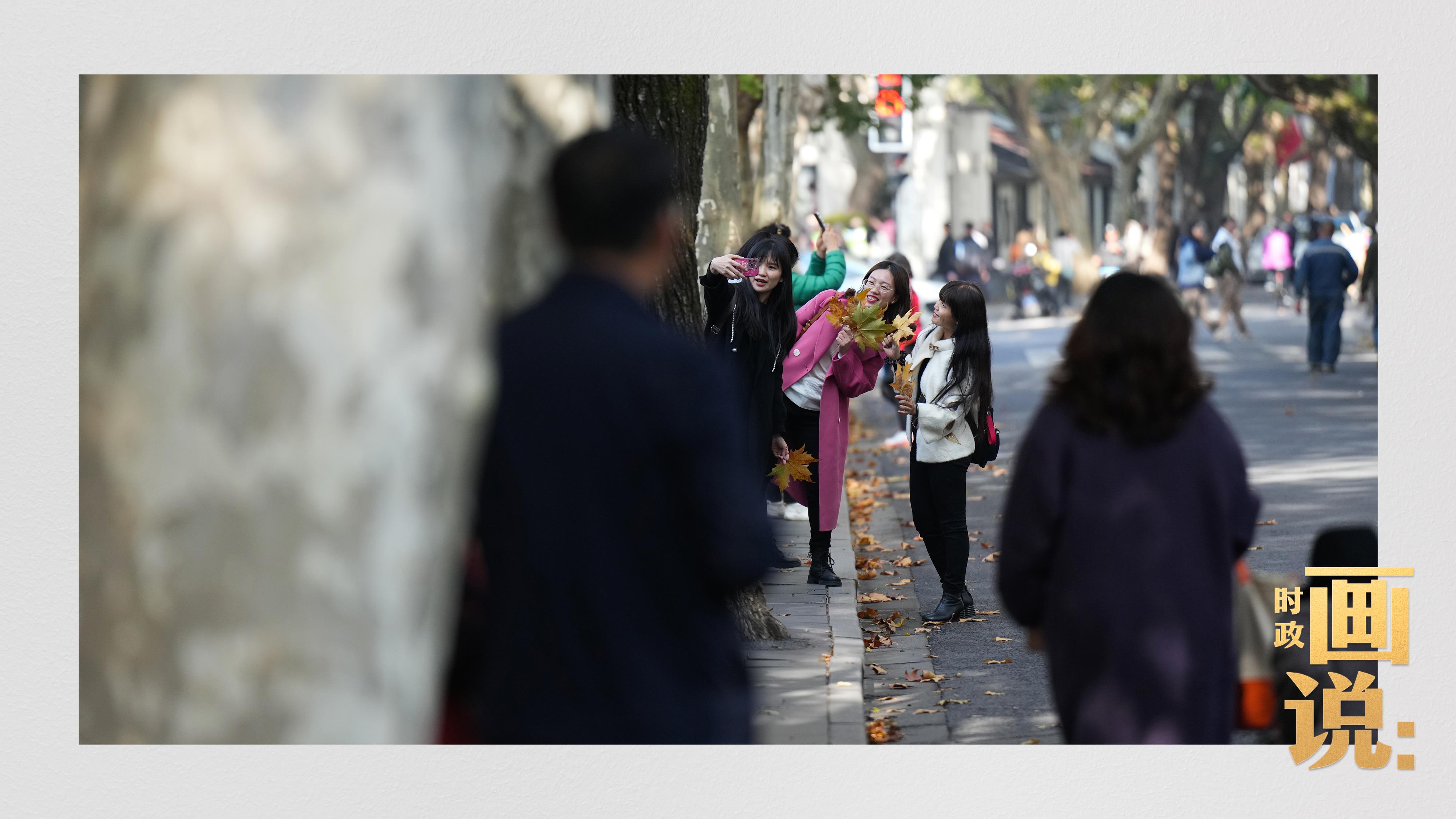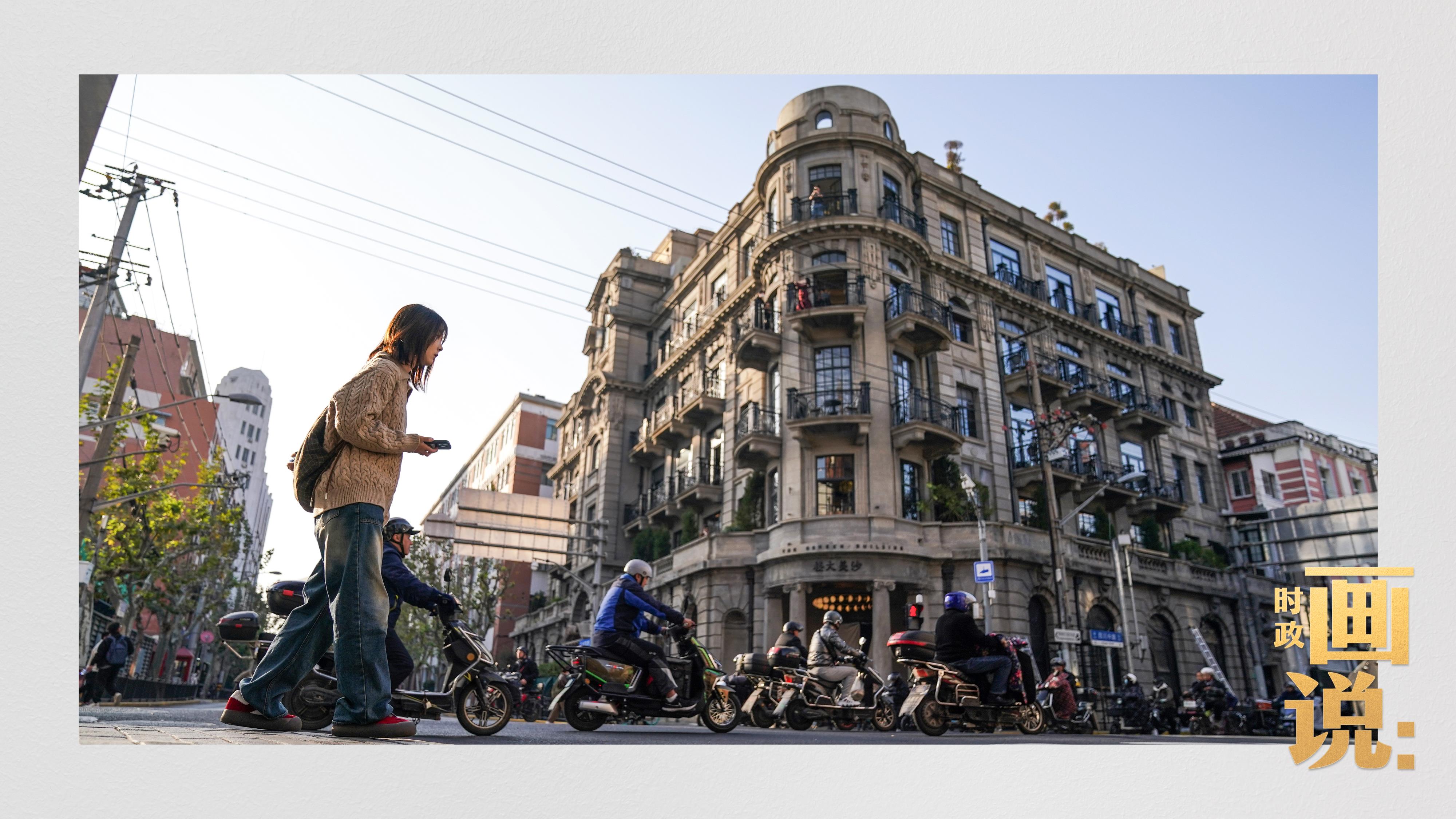 △武康大楼前留影的外籍游客兴奋不已。淮海中路,上海。