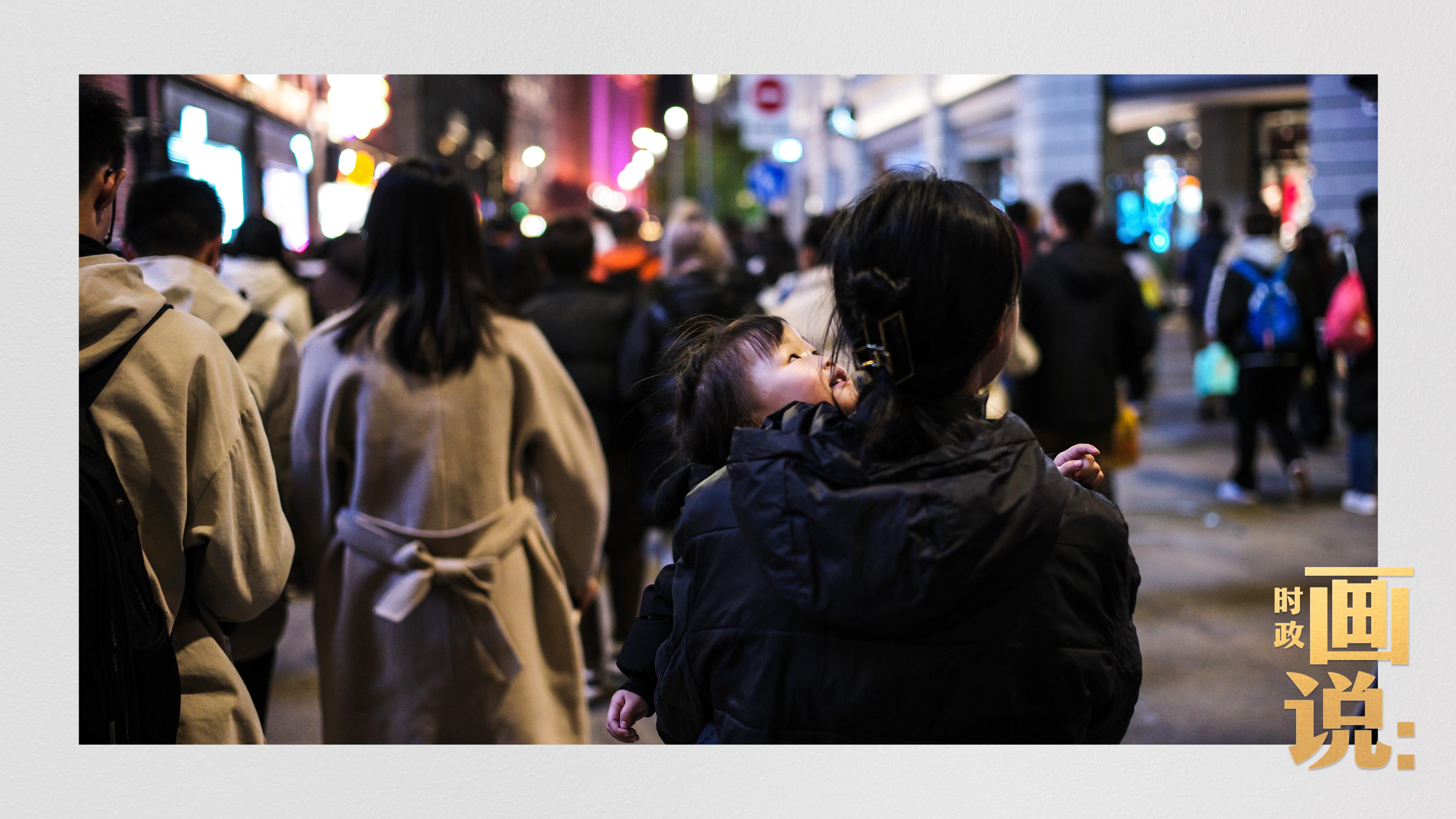 △母亲怀抱中的小女孩仰望灯火璀璨的高楼大厦。南京路步行街,上海。