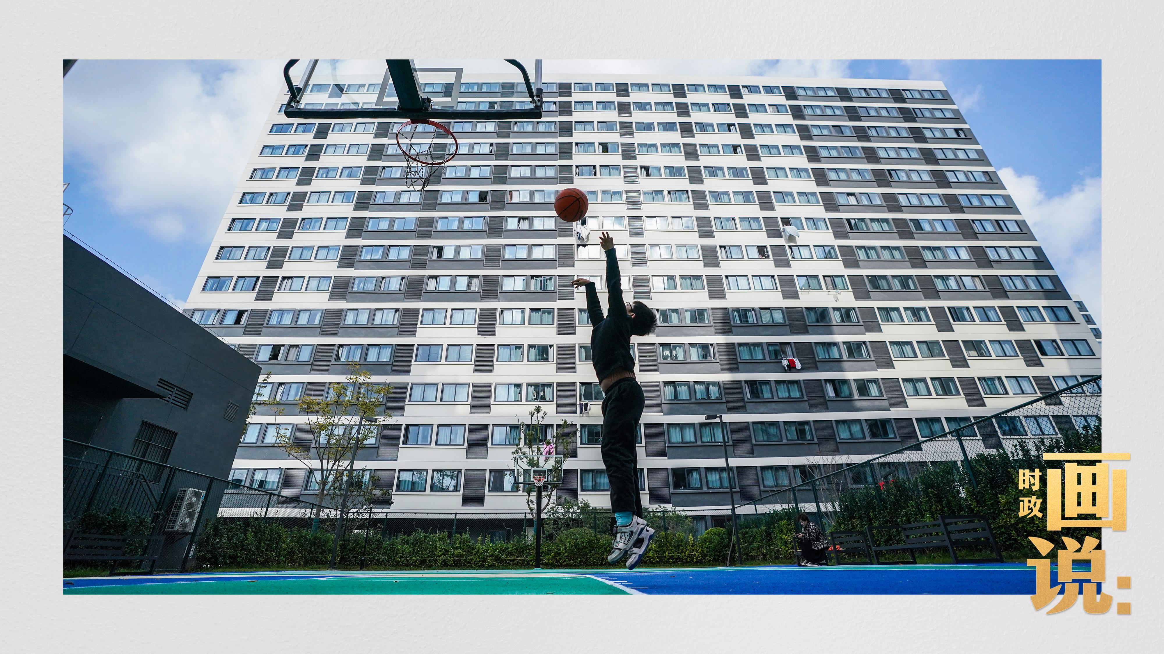 △社区篮球场上练习投篮的小男孩。闵行区新时代城市建设者管理者之家所在的社区是上海市首批大型保障性租赁住房项目之一,为许多来沪新市民、青年人和一线务工人员提供住房保障。闵行区,上海。