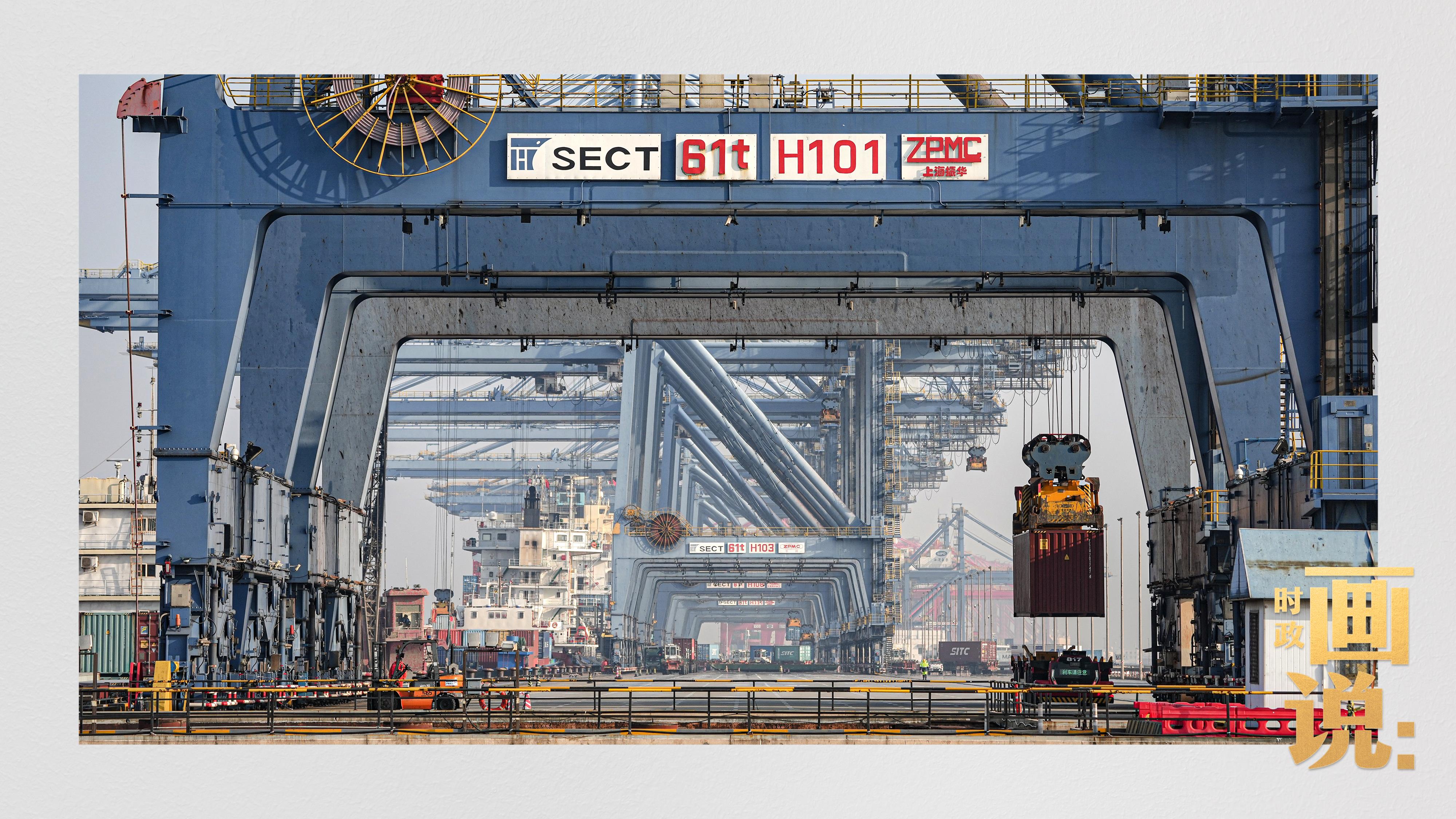 △上港集箱外高桥码头,巨型塔吊正在吊装集装箱货柜。浦东新区,上海。