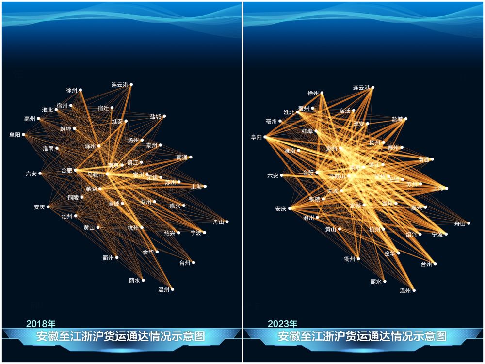 2023年与2018年相比,安徽发送至江浙沪的货运量显著增长,长三角物流更为密集。