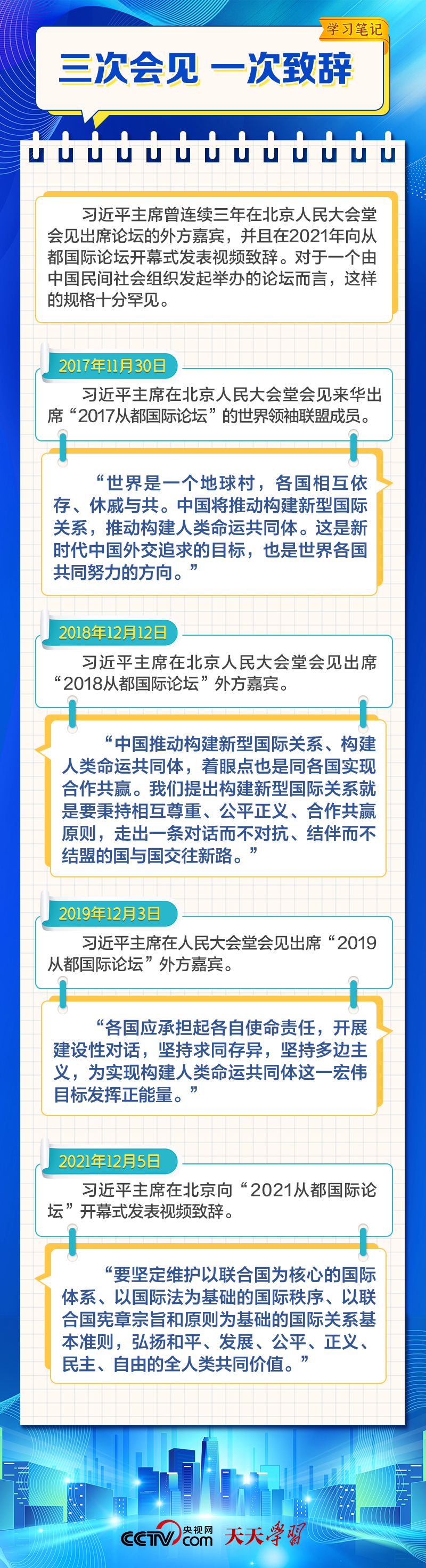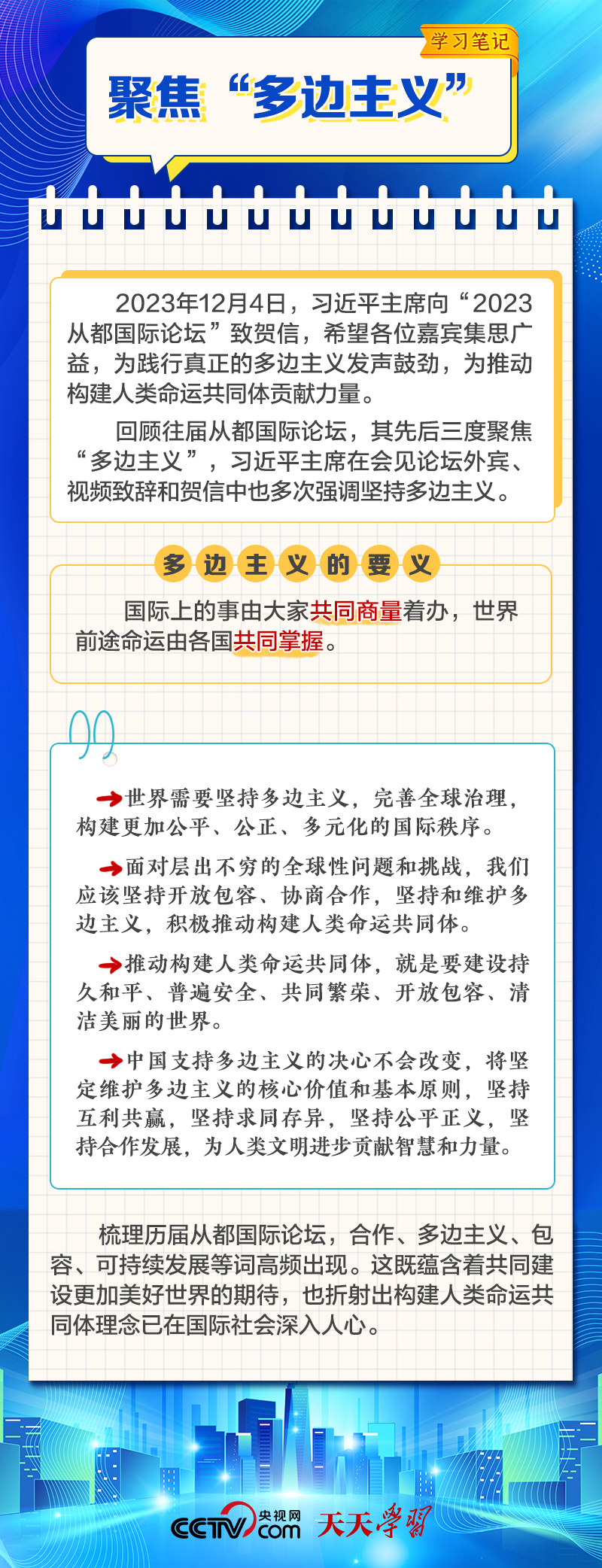 天天学习 12月4日,习近平主席在致“2023从都国际论坛”的贺信中强调,面对前所未有的世界之变、时代之变和历史之变,人类社会必须团结起来,坚持互学互鉴、开放包容、合作共赢,弘扬全人类共同价值,共同建设更加美好的世界。